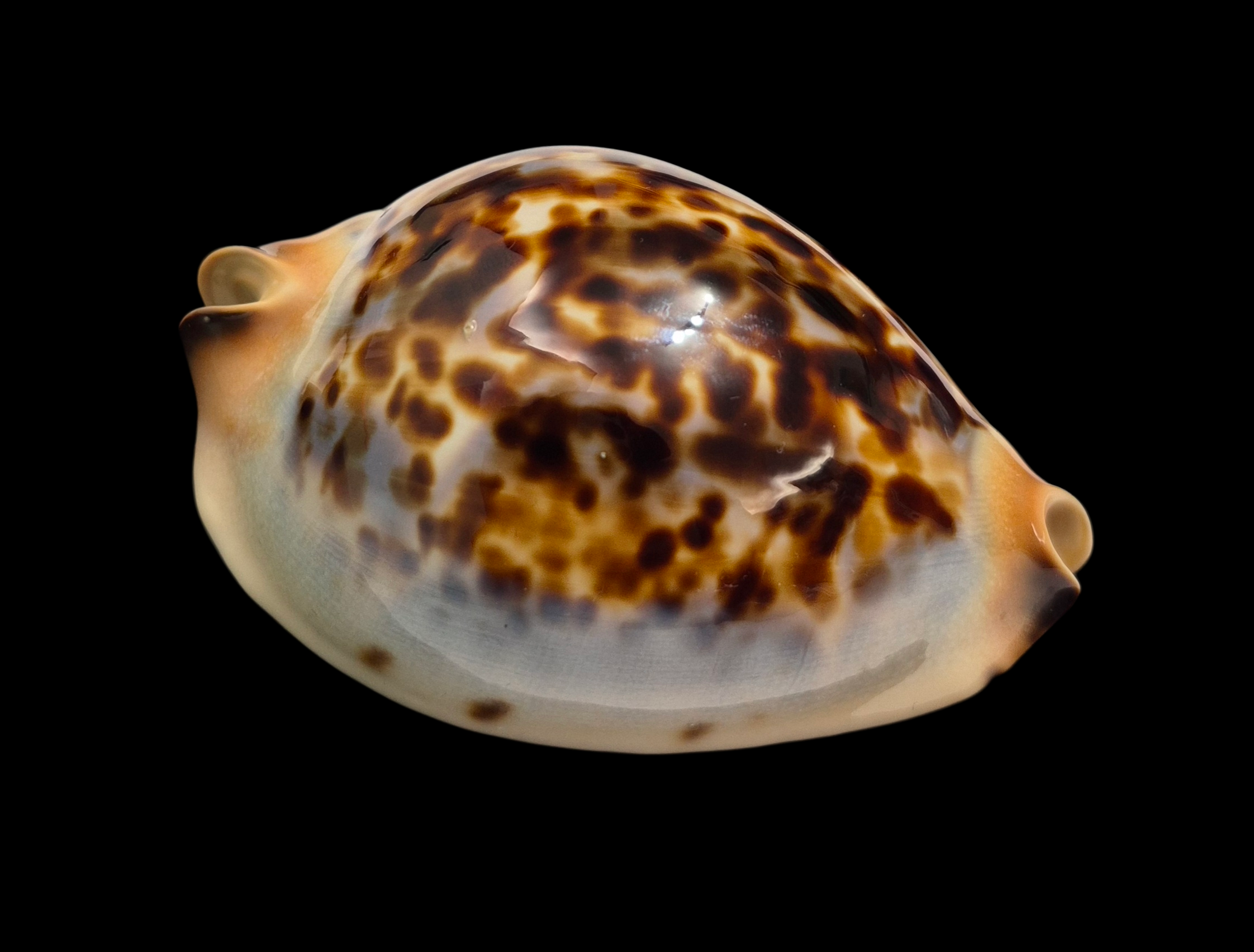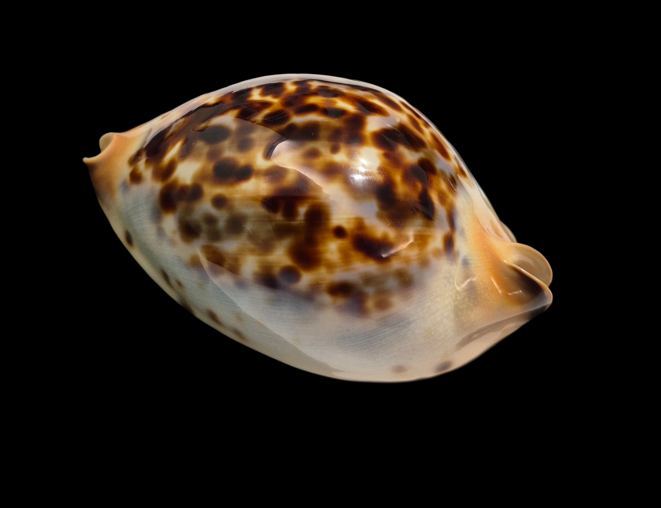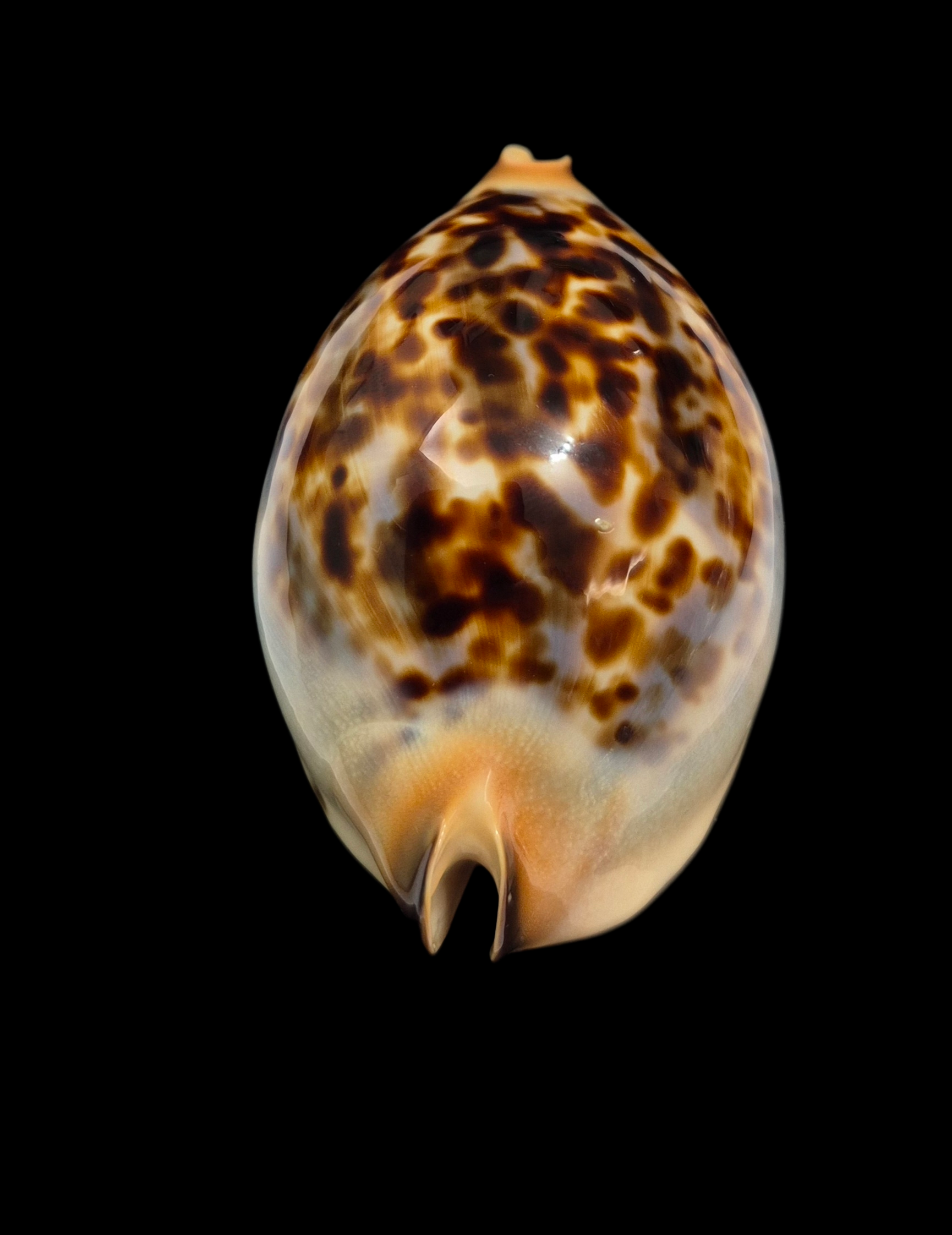 Amazing specimen, live taken, collected by ROV at near 77 meters depth off W/NW of Kalbarri. This is the only one specimen found having a golden base! The shell has uncommon brown spotted dorsum, blue halo and cream margins. This awesome zoila isn’t 100% gem only because one very tiny natural pimple/inclusion on posterior dorsum: but it’s still a great unique beauty for collection!