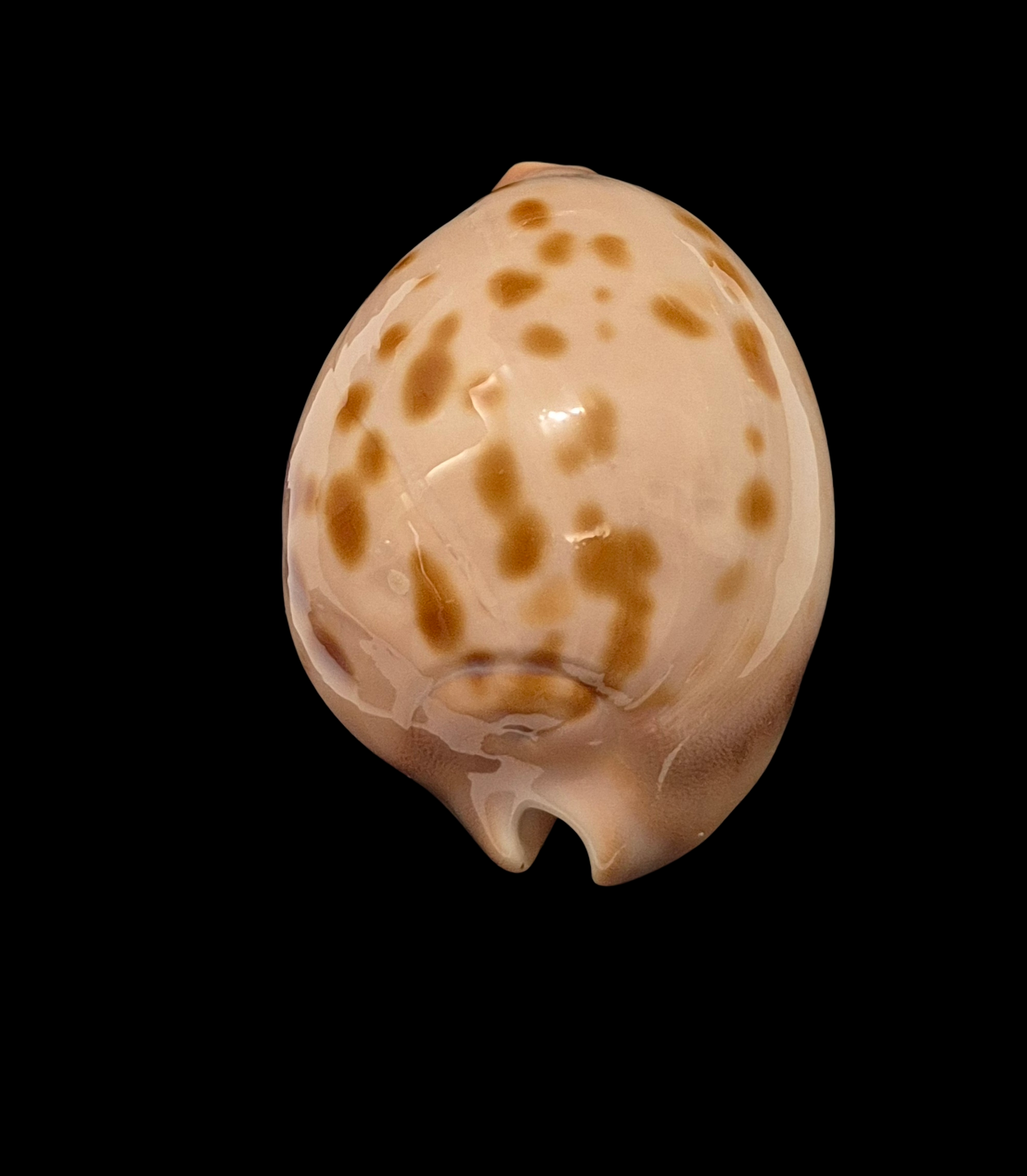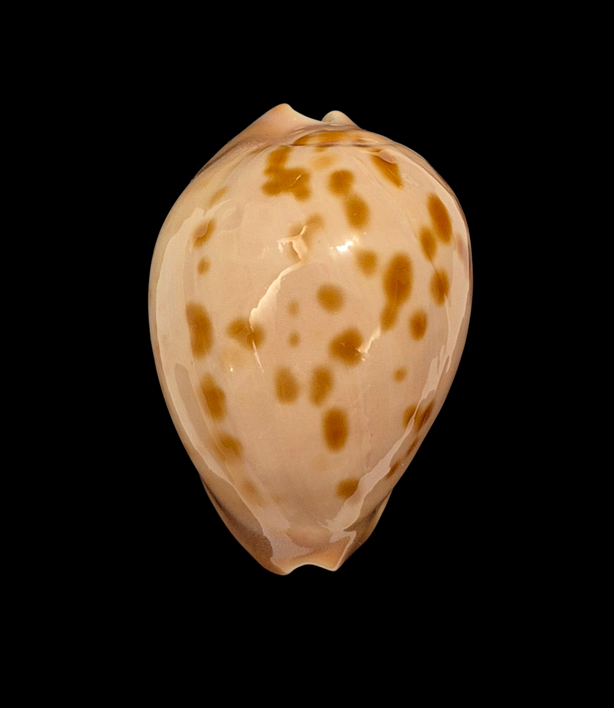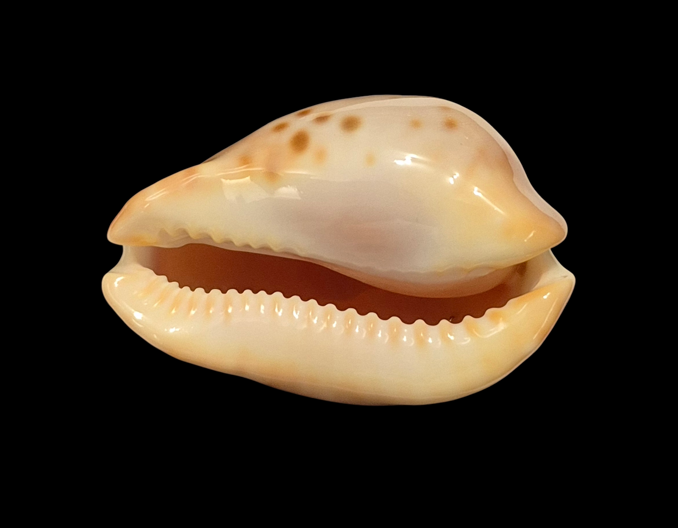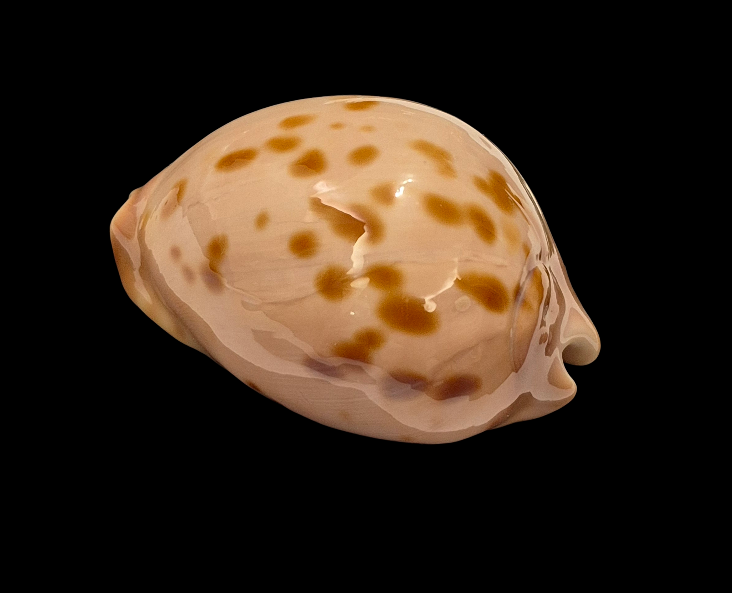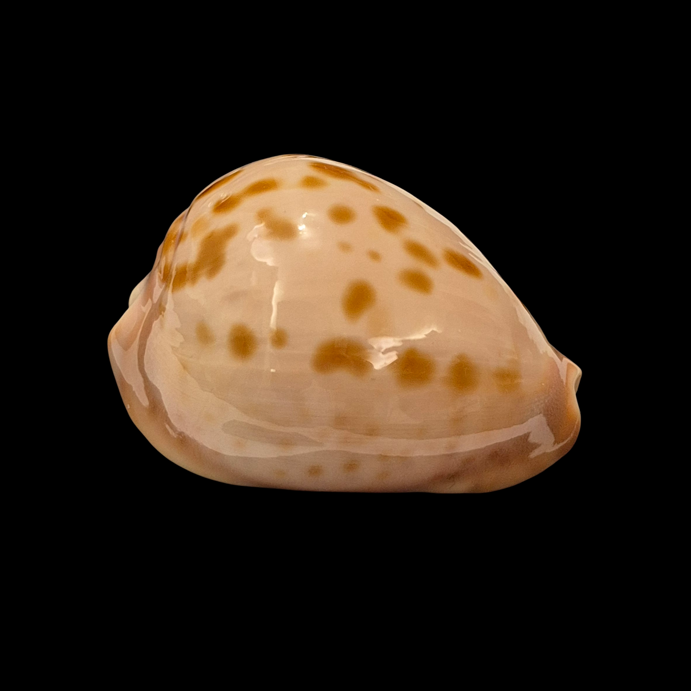 Patternful specimen, live taken, collected off Starvation Bay by scuba diver in marine caves and ledges on limestone and granite reefs at near 20-30 meters of water. Typical beautiful shellwith golden/orange spots on pinkish background, and awesome colorful base. Perfect dark extremities and margins, only few soft natural folds/lines on lateral side.