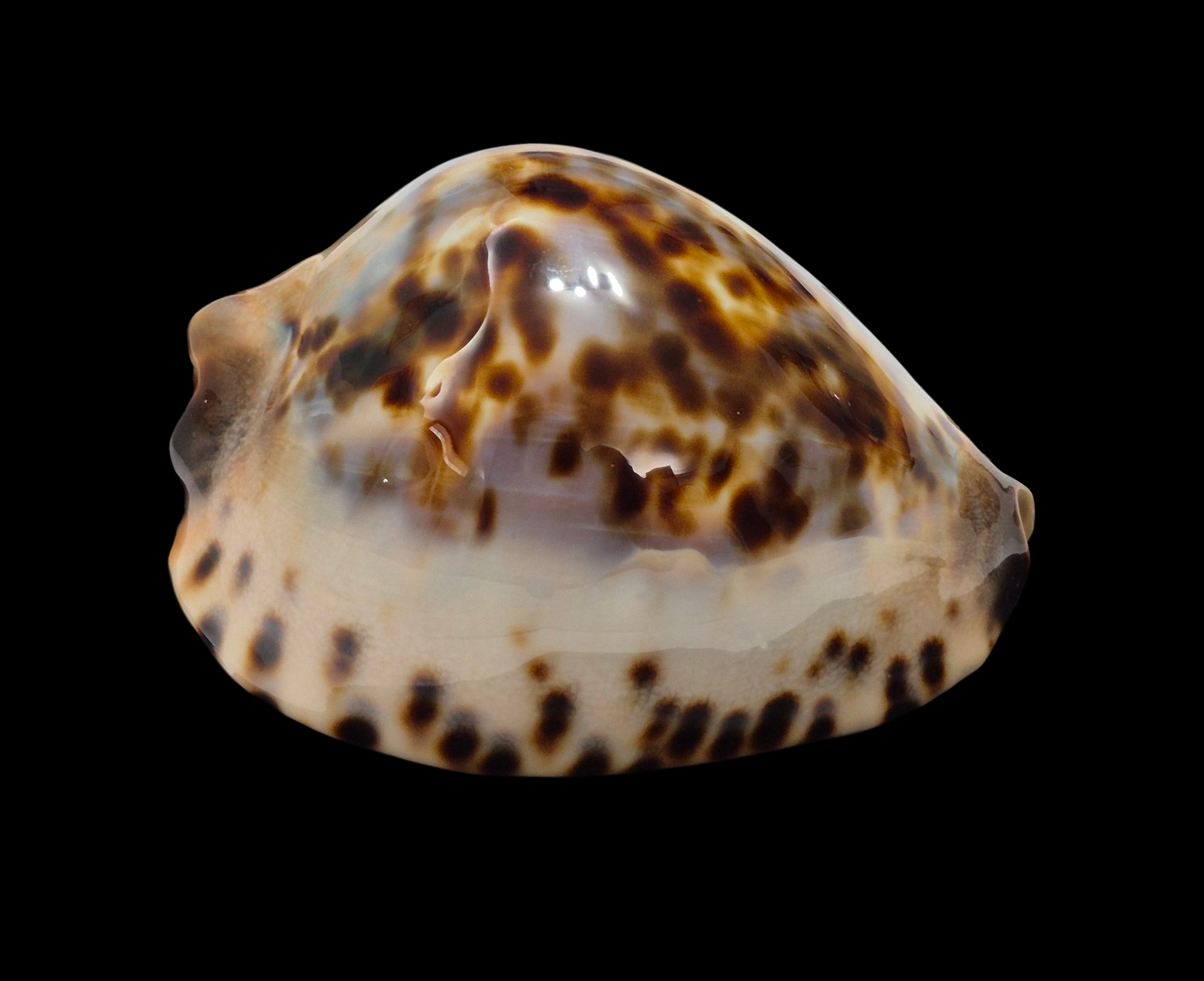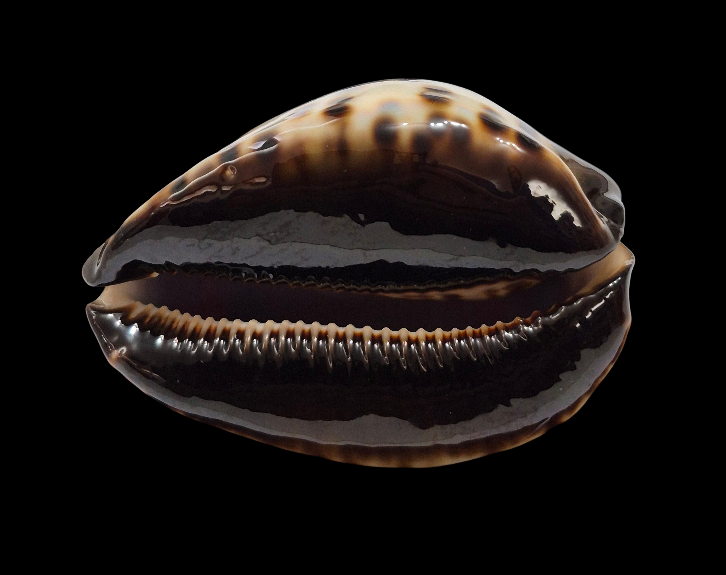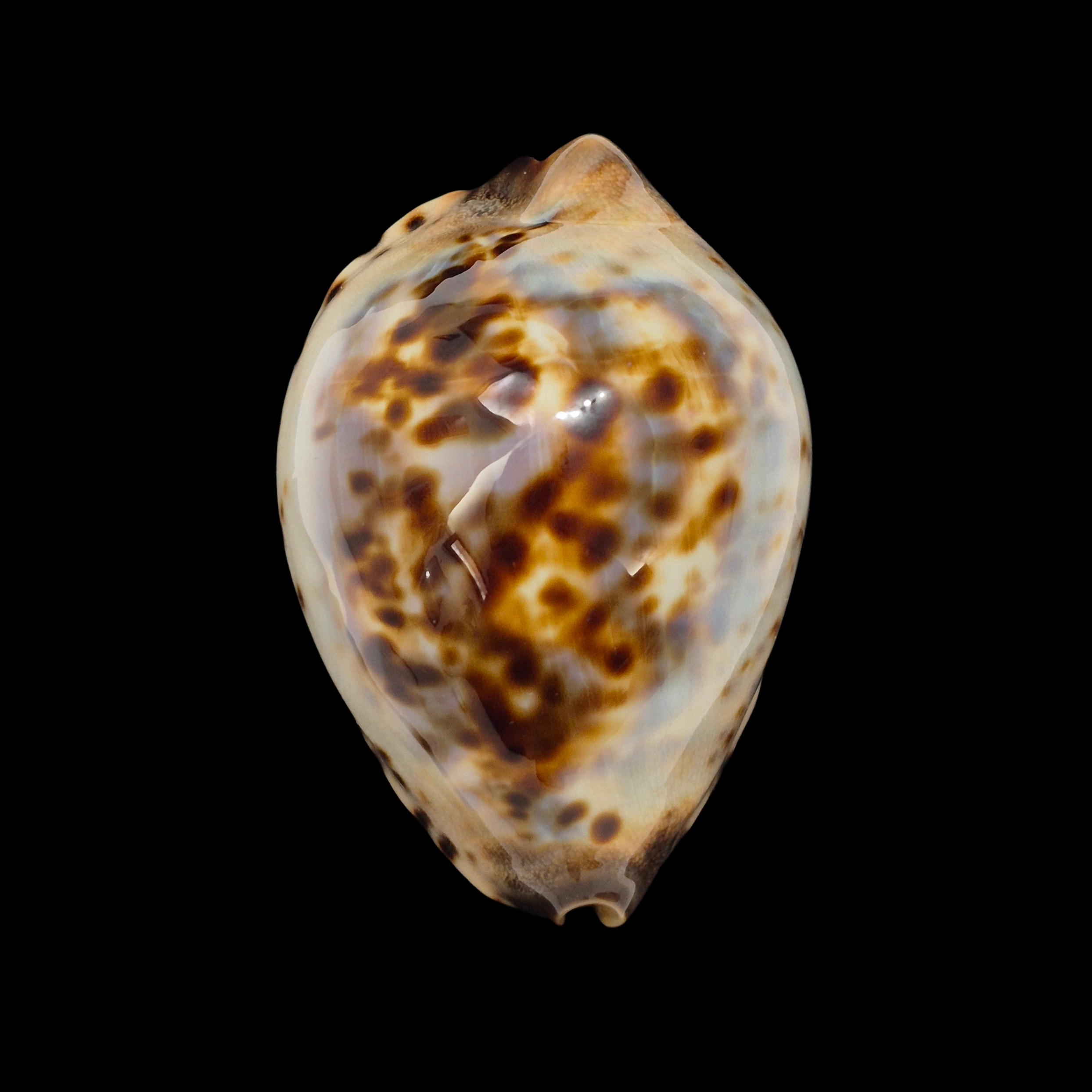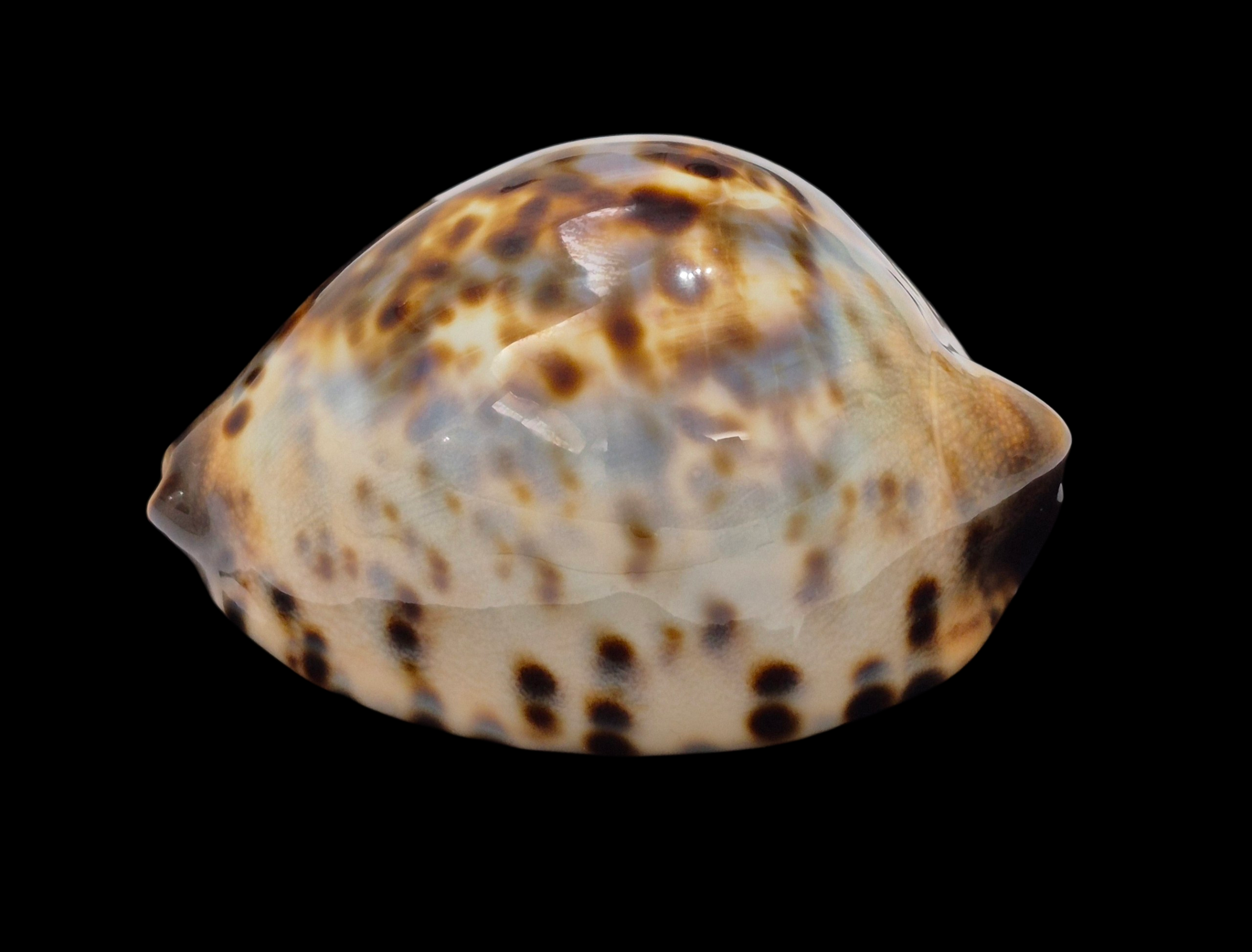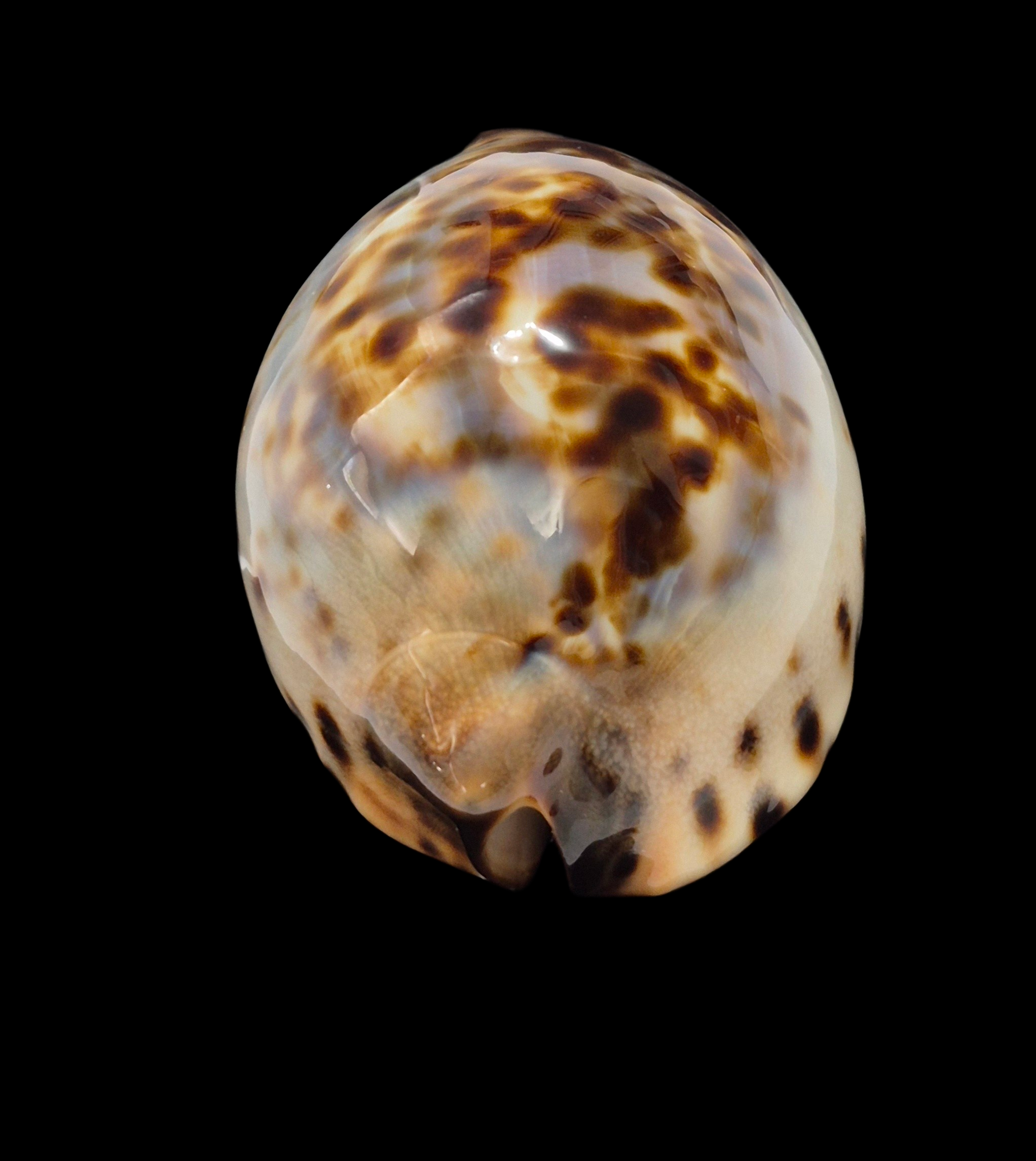 Exceptional live taken specimen, collected by scuba diver off Cape Cuvier at 38-42 meters depth on grey sponge. Great inflated shape, superb pattern with some blue, very high whitish margins with several big black spots, wide dark chocolate base, excellent extremities. A top shell with only a tiny natural flaw well hidden in the pattern.