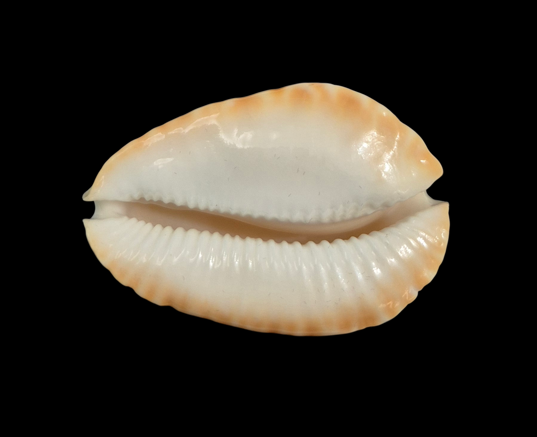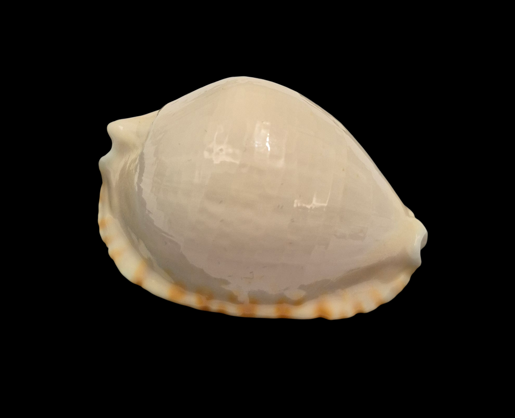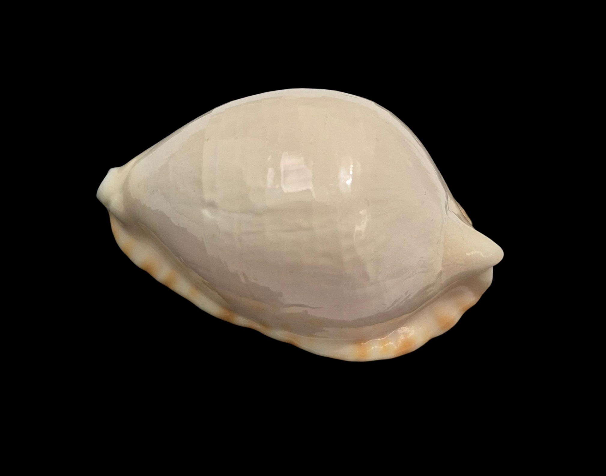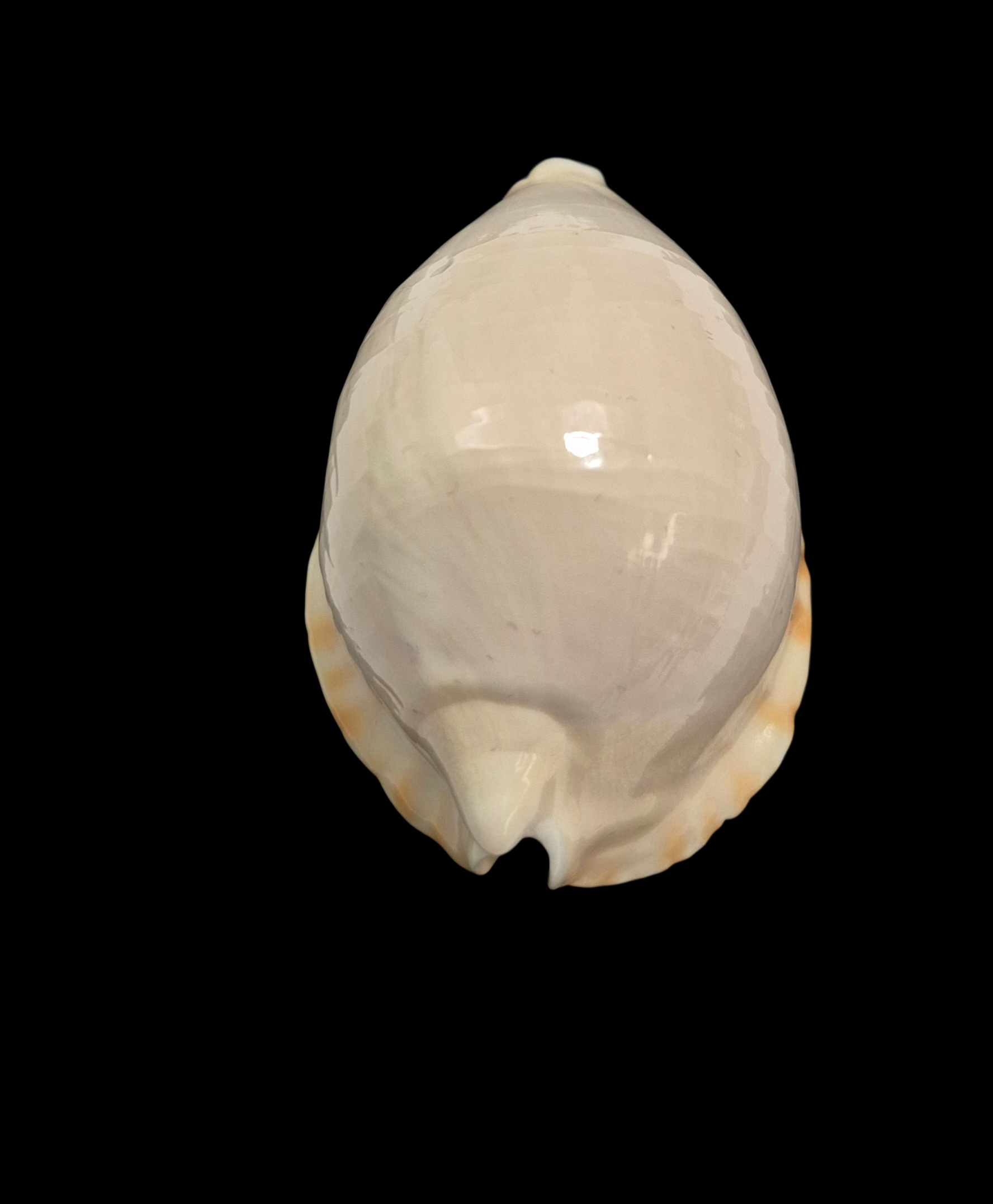 Large specimen, live taken, collected by Rov off False Entrance at near 110 meters depth. Heavy shell with great shape, very callous margins, white dorsum with orange basal trim and lateral spots. Dorsum just a little growthy, but very high quality for the species.