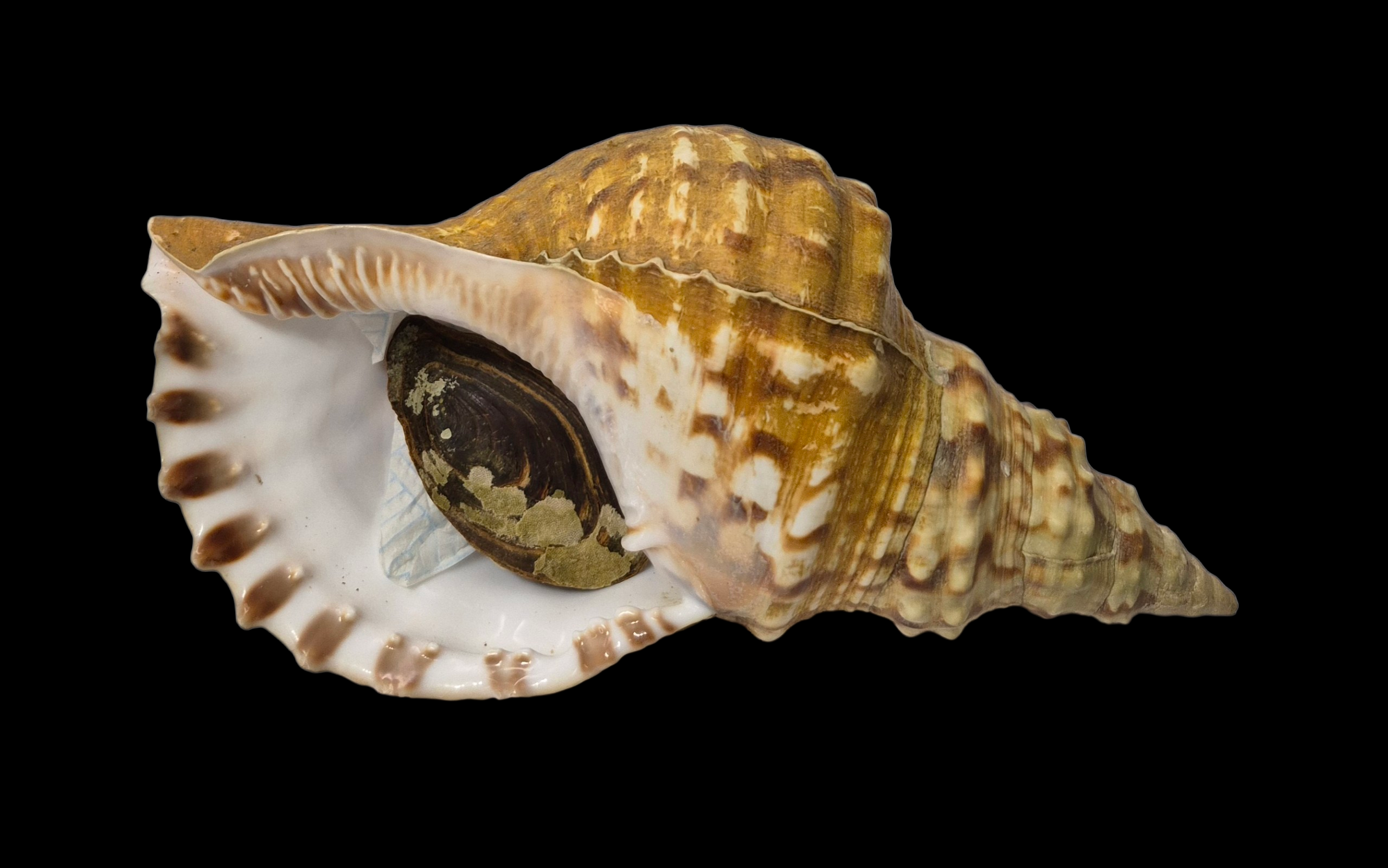 Selected live taken specimen, collected in Mediterranean Sea by fishermen on nets off Trapani, Sicily island, at near 20-30 meters depth. Superb shape, full periostracum, with its operculum. Excellent quality with only little natural irregularities/imperfections.